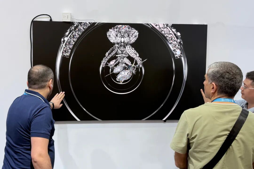 ▲广交会海外客商观看搭载国星光电AS-0.9(AM Drive)面板方案的超高清显示屏