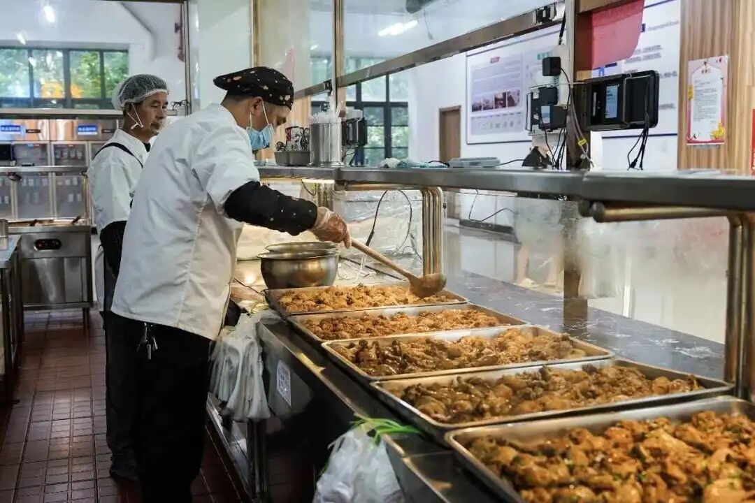 为此,学校一共采购了2350公斤鸡腿,统一卤制成学生喜爱的五香口味,同时搭配了秘制酱料,口感鲜香。全校所有的食堂炉火全开,卤制加浸泡需用时8小时。为让学生们在就餐时段吃到热乎、新鲜的卤鸡腿,食堂工作人员凌晨三点便到岗,紧张有序地开展清洗、卤制工作。“学校为在校学生免费加鸡腿,我们辛苦一点也值得。”一位后厨师傅说道。