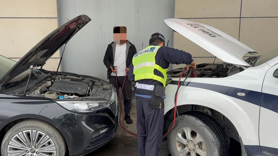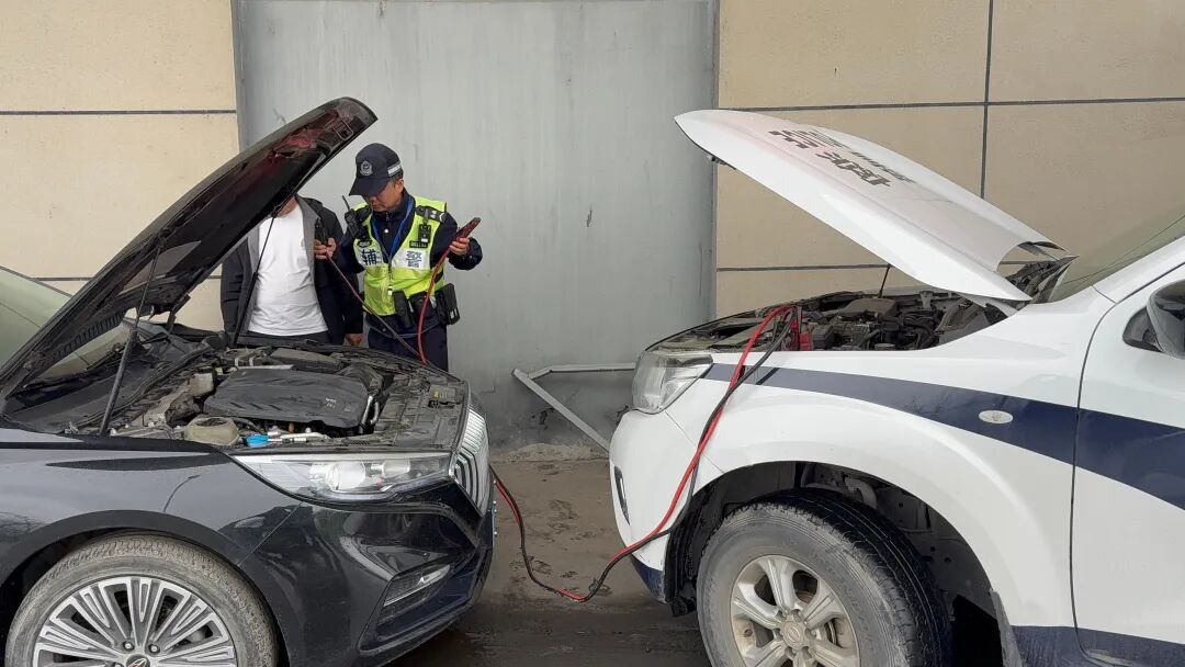 听完男子的遭遇,王敦专和蒋云峰心里满是心疼,一边继续安抚他“别灰心,困难都是暂时的”,一边立刻决定伸出援手。两人陪同男子前往车辆停放地点,随后快速到附近汽修店借来专业搭电工具,熟练地连接警车与故障车辆的电瓶,小心翼翼操作,全程高效有序。没过多久,车辆就成功启动,发出了平稳的引擎声。
