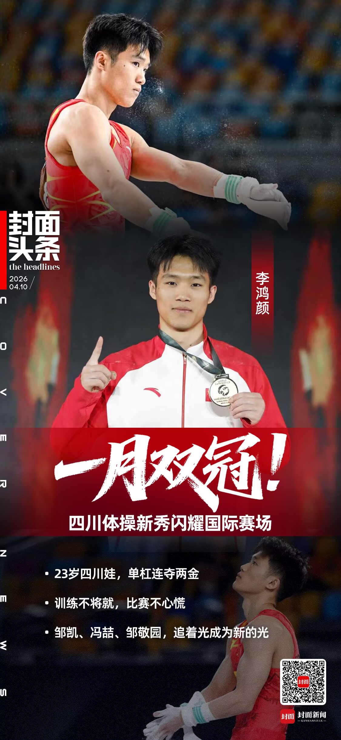 没有惊险逆转,没有压线夺冠,李鸿颜用一套干净、稳定、无可挑剔的动作,直接拿下金牌。不到一个月前,他刚在体操美国杯混合团体赛中,以单杠高分助力中国队拿下混合团体金牌,为洛杉矶奥运会新增小项抢下国际首金。不到一个月,两站国际大赛,两度站上最高领奖台,李鸿颜成了单杠上闪耀的四川“新星”。