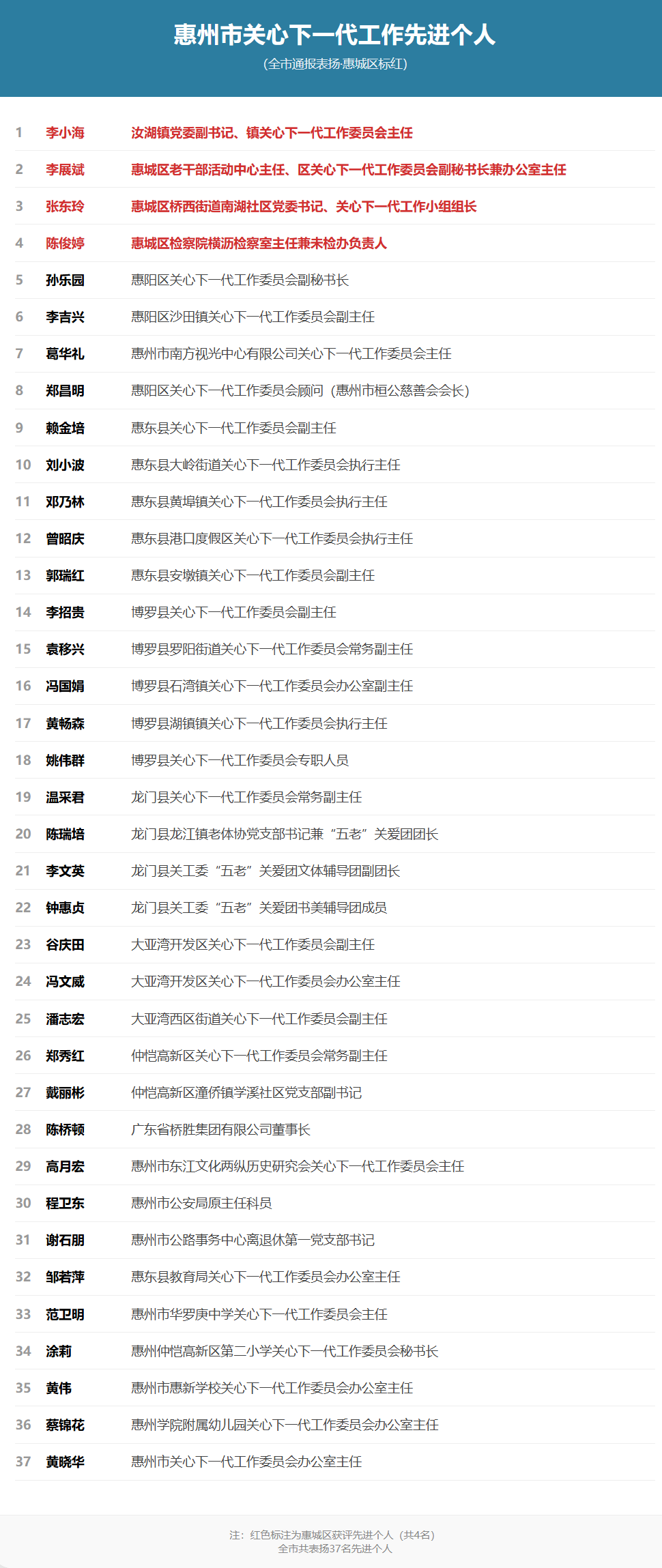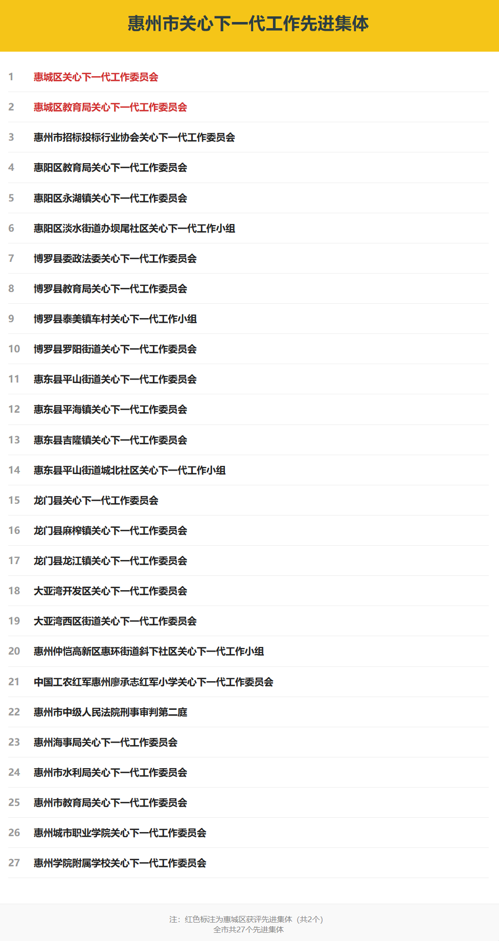 近日,惠州市关心下一代工作总结暨表扬大会召开。会议宣读了《关于表扬全市关心下一代工作先进集体和先进个人的通报》。在通报表扬名单中,惠城区共有2个集体荣获“全市关心下一代工作先进集体”称号,4名个人荣获“全市关心下一代工作先进个人”称号。